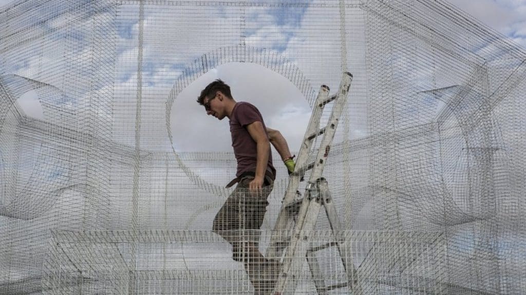 Edoardo Tresoldi indaga le poetiche del dialogo tra uomo e paesaggio utilizzando il linguaggio architettonico come strumento espressivo e chiave di lettura dello spazio. L’artista gioca con la trasparenza della rete metallica per trascendere la dimensione spazio-temporale e narrare un dialogo tra Arte e Mondo, una sintesi visiva che si rivela nella dissolvenza dei limiti fisici delle sue opere.